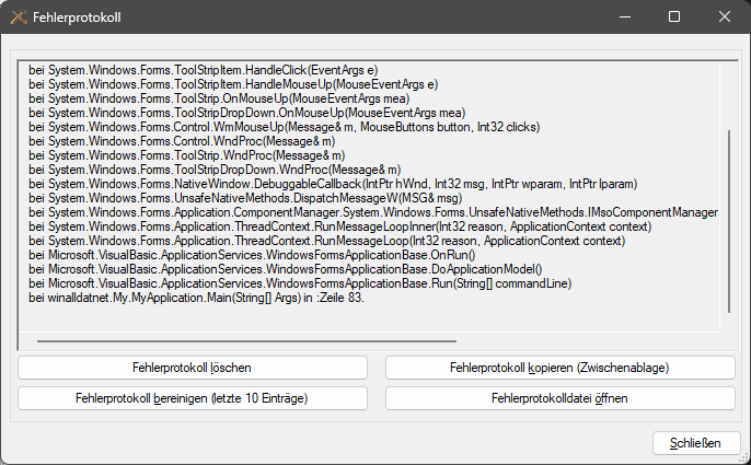 Hilfe Fehlerprotokoll Fehlerprotokoll: Ausgabe des WinAlldat Net Fehlerprotokolls zum Versand z.B. per E-Mail an den IVDK IT Support. Standardausgabe pro klinischem Arbeitsplatzsystem (KAS) in die Datei "winalldatnet.log"