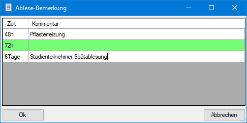 ProgrammhilfeTagesroutineAblesungen/Reaktionen Ablesebemerkung Besondere Hinweise zu den Ablesungen bzw. Reaktionen pro Ablesezeitpunkt können hier dokumentiert werden.