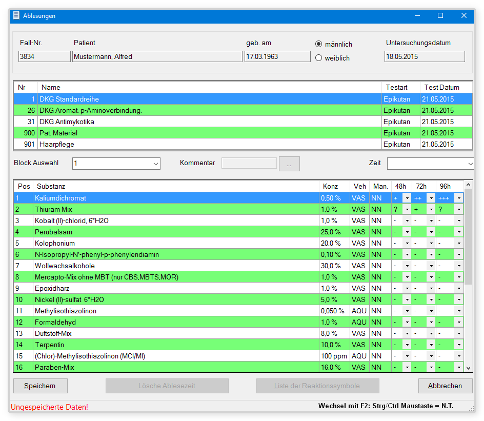 •Direkte Eingabe der Daten in den Computer während der Ablesung am Patienten. Der Patient steht sozusagen mit dem Rücken neben dem Bildschirm des Computers und der Dermatologe teilt der MFA/MTA Ablesezeitpunkt und Reaktion mit, so dass diese direkt erfasst werden. Die verschiedenen Testblöcke werden einer nach dem anderen ausgewählt und abgelesen. Die Reihenfolge spielt keine Rolle, aber vergessen Sie keinen!