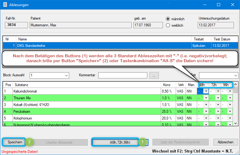 •Die Schnellspeicherung aller Ablesungen per Tasten-Kombination erfolgt mit Alt-S (=Sichern) und der Abbruch erfolgt mit Alt-A (=Abbruch). Alle Ablesezeitpunkte können angelegt und abgelesen werden. Erst nach Eingabe aller Reaktionen pro Testreihe ist eine Speicherung der Testergebnisse nötig. Unten links im Ablesedialog wird "Ungespeicherte Daten" angezeigt, falls eine Speicherung der Daten geboten ist.