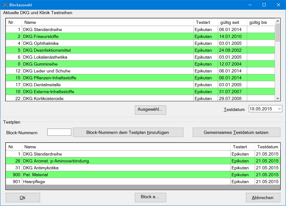 DKG-und Kliniktestreihen auswählen bzw. einen Testplan erstellen