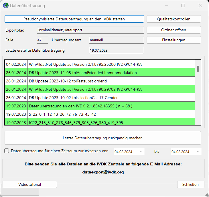 Datenübertragung: 1. Daten Export und 2. anschließender Versand der 3 Exportdateien per e-mail an dataexport@ivdk.org. Bitte beachten sie die Videoanleitung zur Datenübertragung unter https:// winalldatnet.ivdk.org/video/winalldatnet_datenuebertragung.mp4
