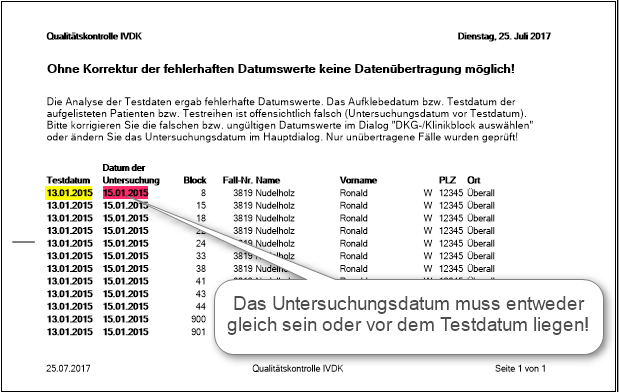 Diese Funktion exportiert in einem 1. Schritt - in pseudonymisierter und verschlüsselter Form - 3 Dateien zur statistisch-epidemiologischen Auswertung auf ihren lokalen PC. Prüfen Sie mit Hilfe des Buttons Qualitätskontrolle und den Standardeinstellungen im Datenübertragungsdialog die Datenqualität: es wird ein Bericht mit evtl. vorhandenen fehlerhaften Datumswerten und fehlenden Daten zu Anamnese, Beruf und Relevanz für die noch nicht übertragenen Fälle erstellt. Mit dem WinAlldat Net Programm können die fehlerhaften Datumswerte wie Testdatum oder Untersuchungsdatum sowie die fehlenden Daten korrigiert bzw. nachgetragen werden. Ohne Korrektur von fehlerhaften Datumswerten wird der Datenexport - und damit auch die Datenübertragung an den IVDK - blockiert!