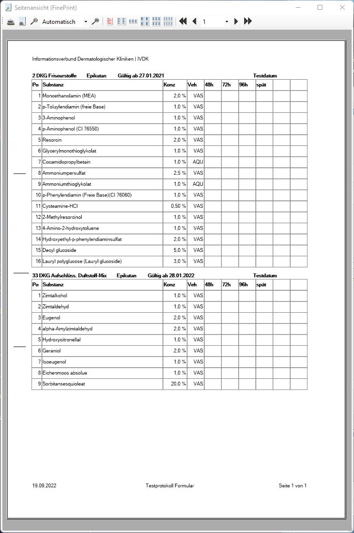•Entwerfen und verwalten Sie Ihre eigenen Testprotokoll Formulare und binden Sie optional Ablesezeitpunkte ein. Beliebige Testreihen derselben Testart können kombiniert werden; der Screenshot zeigt 2 DKG Testreihen mit der Testmethode Epikutan.