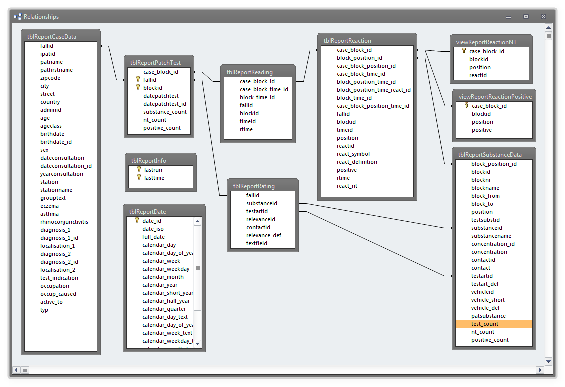 Die folgende Grafik veranschaulicht die zugrundeliegenden Datenstrukturen, die im WinAlldat Net Listenprogrammes zum Einsatz kommen. Die Datei "winalldatnetrep.db3" liegt im SQLite Format vor und kann per SQLite ODBC Treiber in MS Access für eigene Berichte und SQL-Abfragen eingebunden werden. Informationen hierzu erhalten sie beim IT Support des IVDK