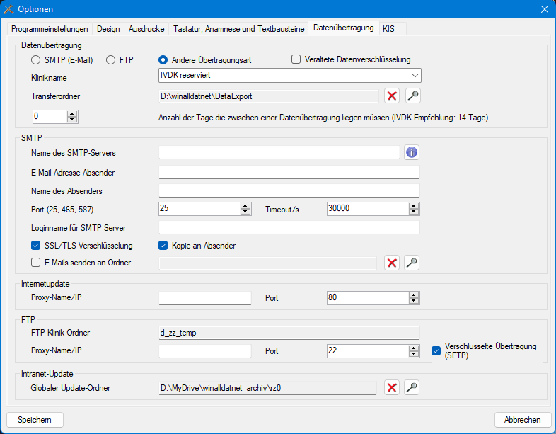 In diesem Dialog stellen sie alle relevanten Parameter zur Steuerung der Datenübertragung an die IVDK Zentrale ein. Standardmässig ist die manuelle Datenübertragung (i.e. Andere Übertragungsart s. Screenshot) voreingestellt. Aktivieren Sie bitte KEINE andere Datenübertragungsoption ohne Rücksprache mit ihrer lokalen IT Fachabteilung, da i.d.R. die Netzwerk-Infrastruktur durch Firewalls geschützt wird und besondere Einstellungen wie z.B. ein Proxy nötig sind.
