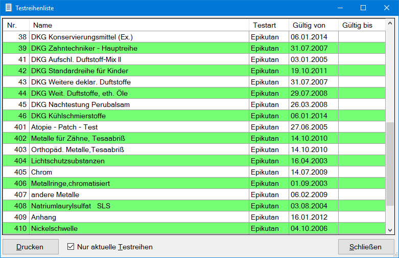 Liste der aktuellen DKG- und Kliniktestreihen zur Testplanung. Optional sind auch historische Testreihenlisten durch Deaktivierung der Checkbox "Nur aktuelle Testreihen möglich. Per Maus-Doppelklick in die Liste ist auch ein Export als HTML Datei zur Weiterverarbeitung in Textverarbeitungen wie Word, Open- oder LibreOffice möglich.